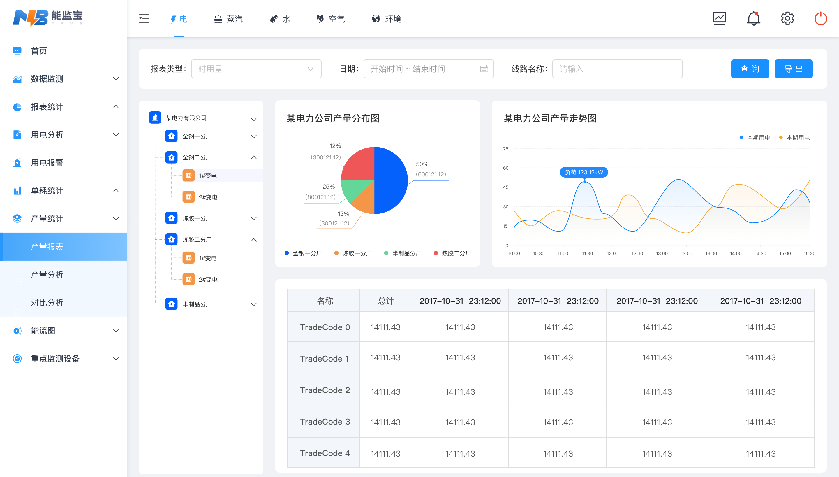 系統通過(guò)AI人工智能算法,以圖標透視等方式展現,支持圖表導出,為決策者和管理者提供精準施策的能源管理依據。